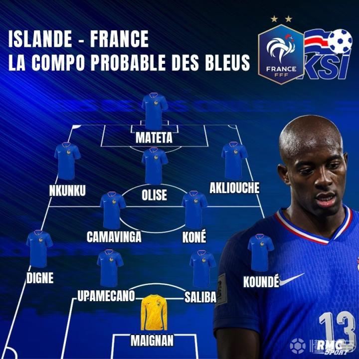 北京时间10月13日,RMC体育为我们带来了世预赛法国客场对阵冰岛的首发名单预测,德尚教练预计会进行大规模的轮换,马特塔和阿克利乌什这两位新星,有望在法国国家队迎来他们的首次首发机会!
